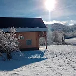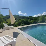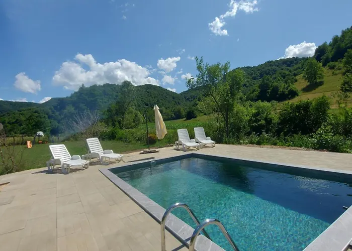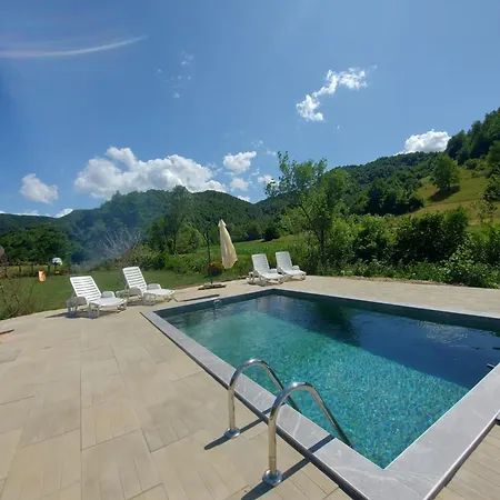 寝室1室のGornji Volari Vikendica Mandicヴィラには、庭園の景色を望むテラスとプライベートなプールがあります。